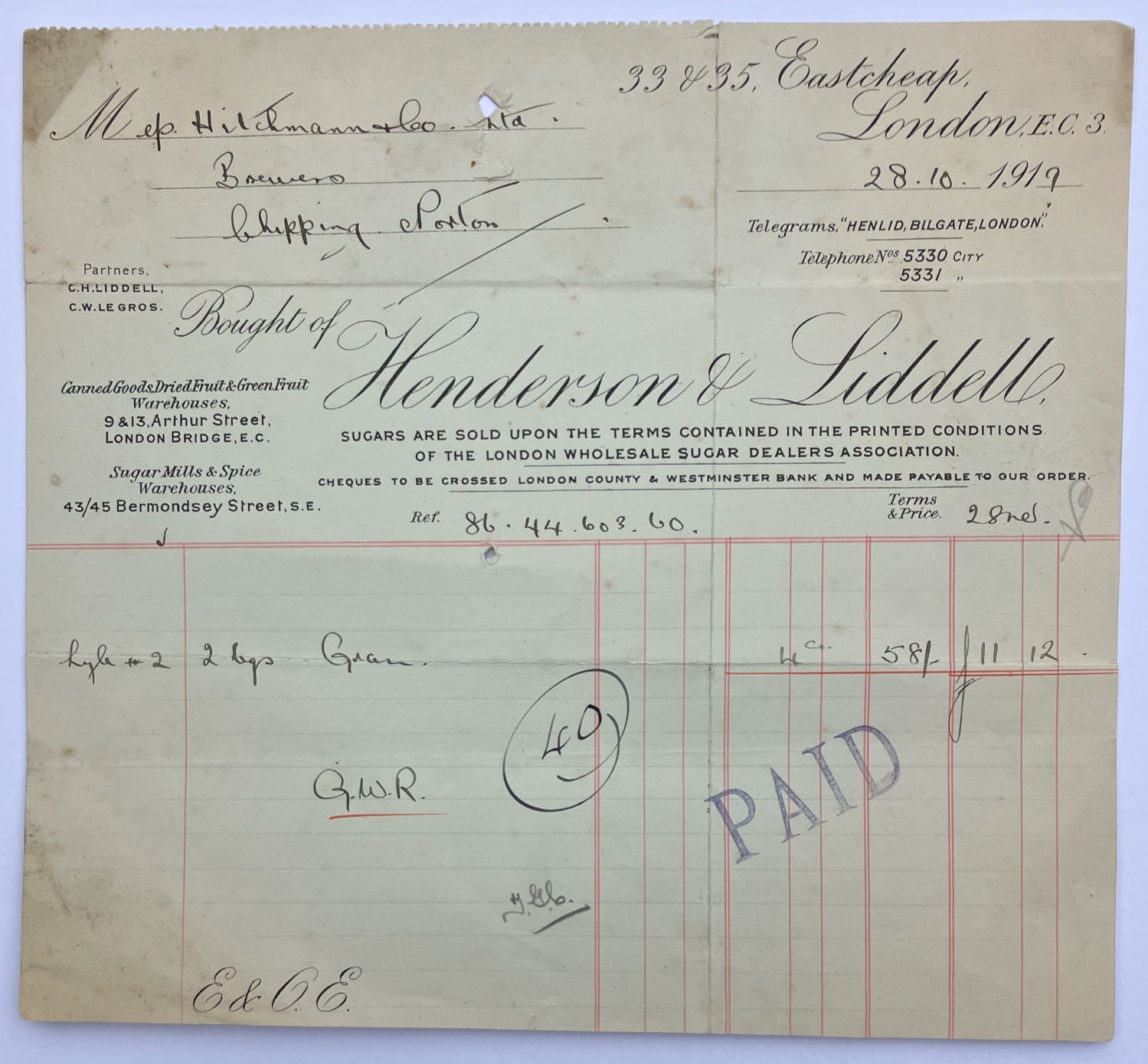 * Invoice ... Original invoice of 1919 from Henderson & Liddell, of 33 & 35 Eastcheap, London, EC3, to Messrs Hitchmann & Co, brewers of Chipping Norton, for the supply of 2 bags (4cwt) of Lyle's granulated sugar ...