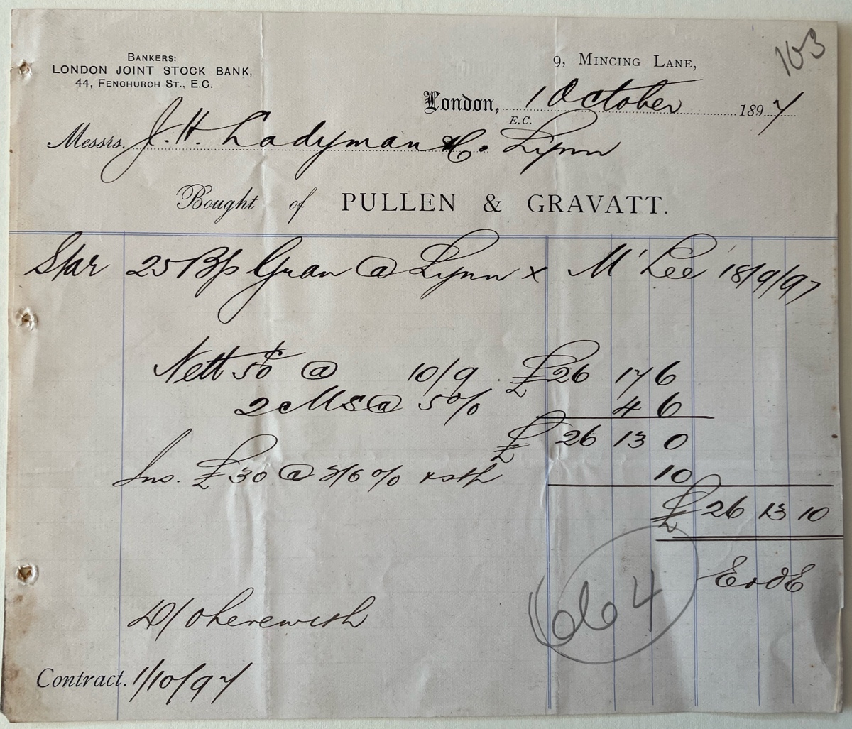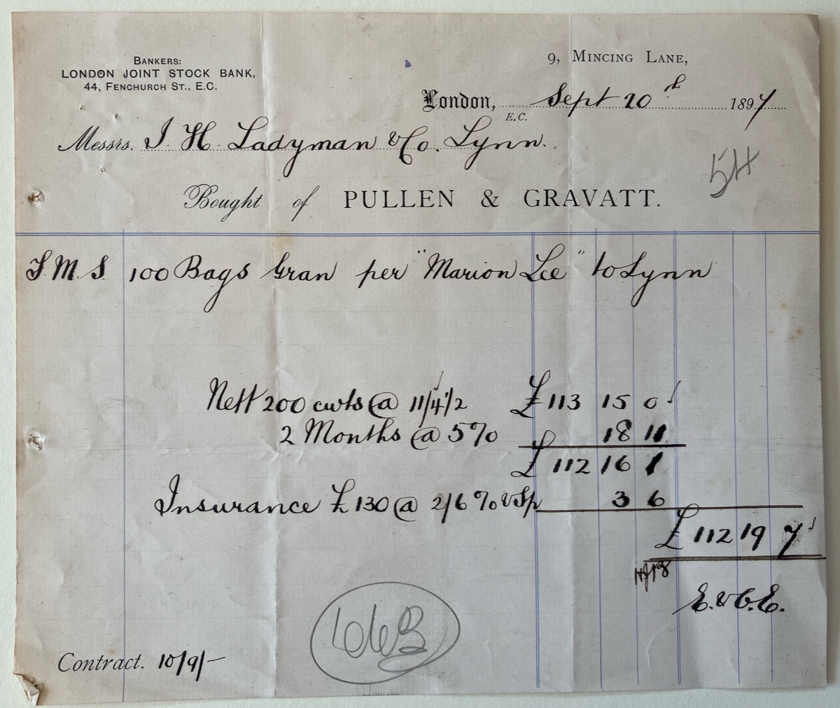 x2 Invoices ... of London brokers Pullen & Gravatt for granulated sugar, shipped from London to grocer J H Ladyman of Kings Lynn aboard the steamer 'Marion Lee' - dated 1897.