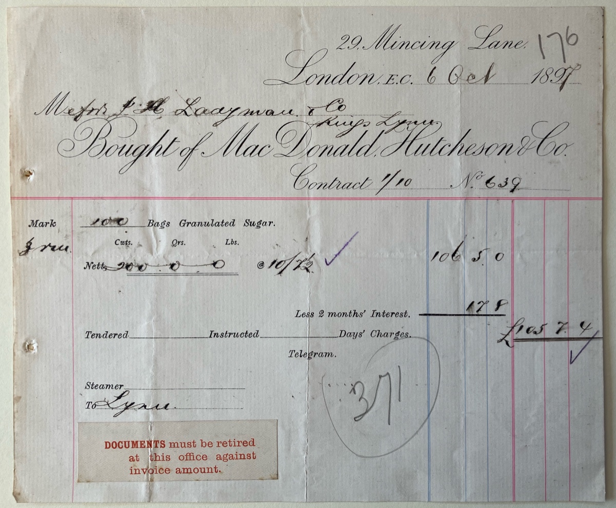 Invoice ... of London brokers MacDonald, Hutcheson & Co for granulated sugar, shipped by steamer from London to grocer J H Ladyman of Kings Lynn - dated 1897.
