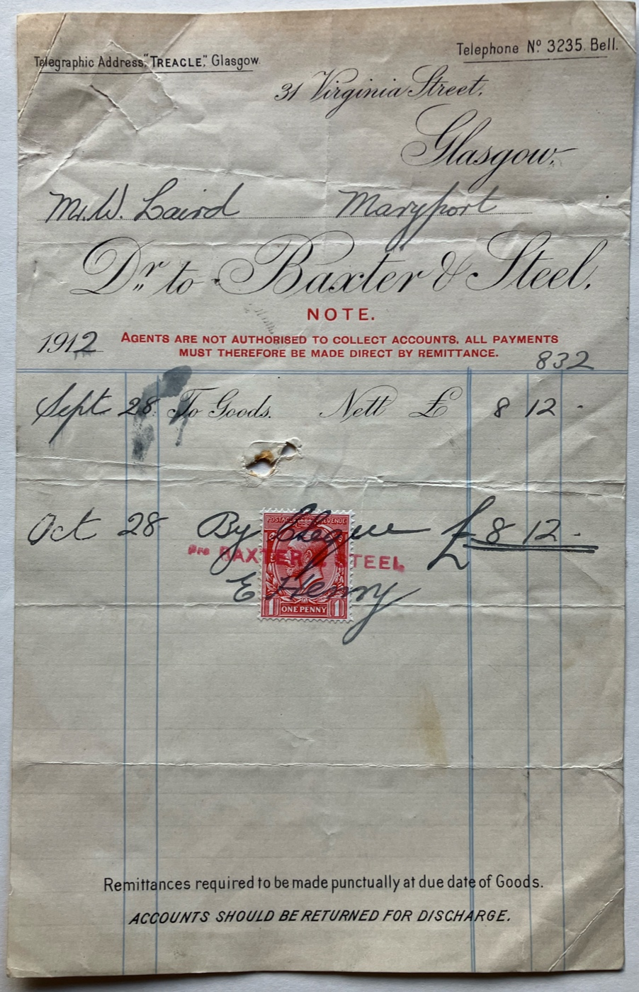 Invoice ... Original invoice of 1912 from Baxter & Steel, sugar merchants, of 31 Virginia St, Glasgow, to Mr W Laird of Maryport, for the supply of goods ...