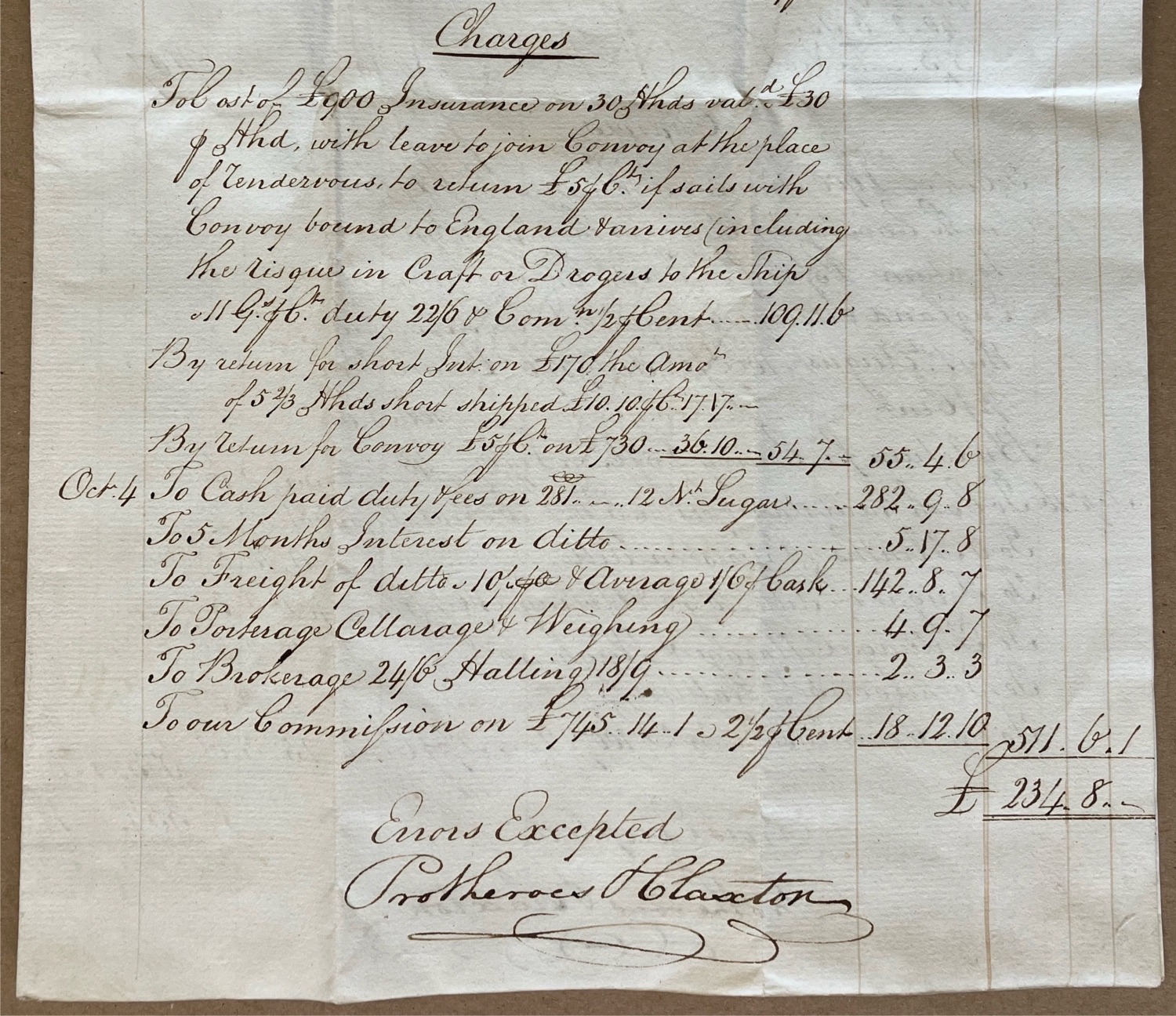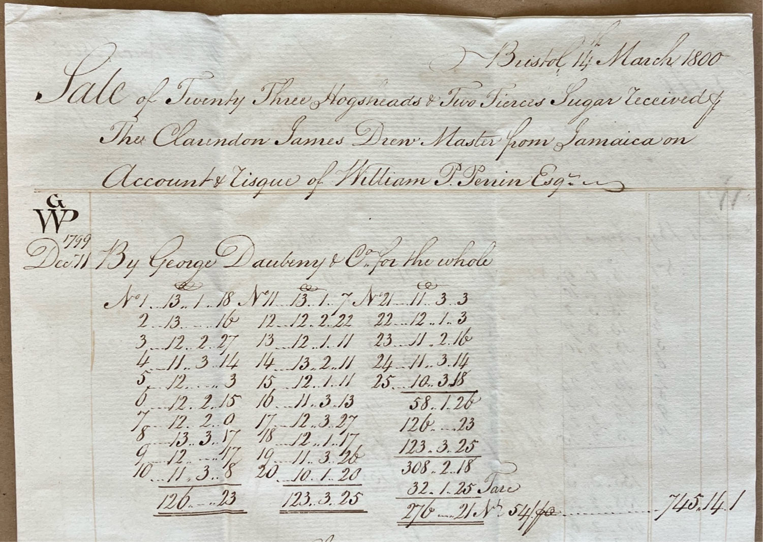 Letter/Invoices ... Original letter, with 2 invoices, from Protheroes & Claxton, a significant Bristol West India merchant firm and one of Bristol's largest sugar importers in 1800, to William Perrin, of London, owner of sugar estates in Jamaica. ... Dated 17 March 1800, the company appear to apologize for the low prices they achieved for the latest cargoes on the ships 'Clarendon' and 'Albion', with Perrin receiving little over 30% of the selling price of the sugar. * Bristol 17 March 1800 Sales of Clarendon & Albion Sir Sale of 23 Hhds 2 Trs Sugar G/WP per Clarendon NP 234.8.0 for which sum you will please to receive enclosed our draft on Mr James Man, in your favor at twenty days date.