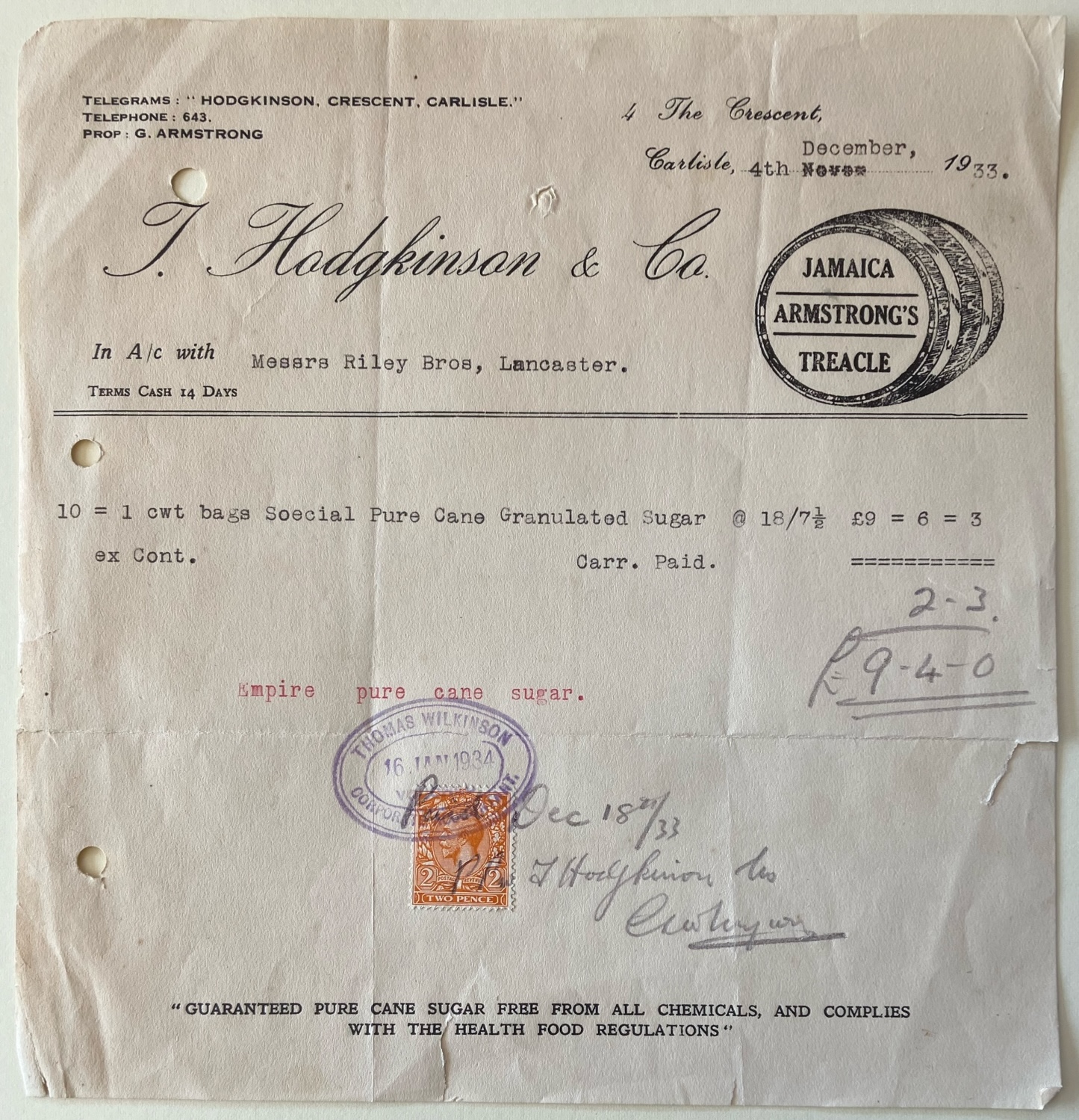 Invoice ... of J Hodgkinson & Co of Carlisle for Pure Cane Granulated Sugar, delivered to Messrs Riley Bros of Lancaster - dated 1933.