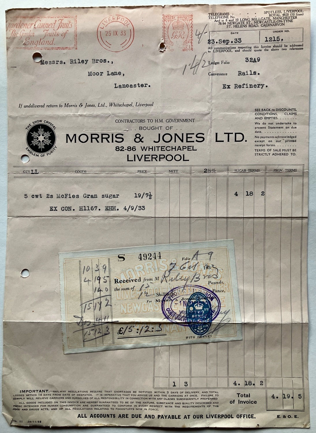 * Invoice ... Original invoice of 1933 from Morris & Jones Ltd, wholesale grocers of 82-86 Whitechapel, Liverpool, to Riley Bros of Moor Lane, Lancaster, for the supply of 5cwt 2s of Macfie's granulated sugar ...