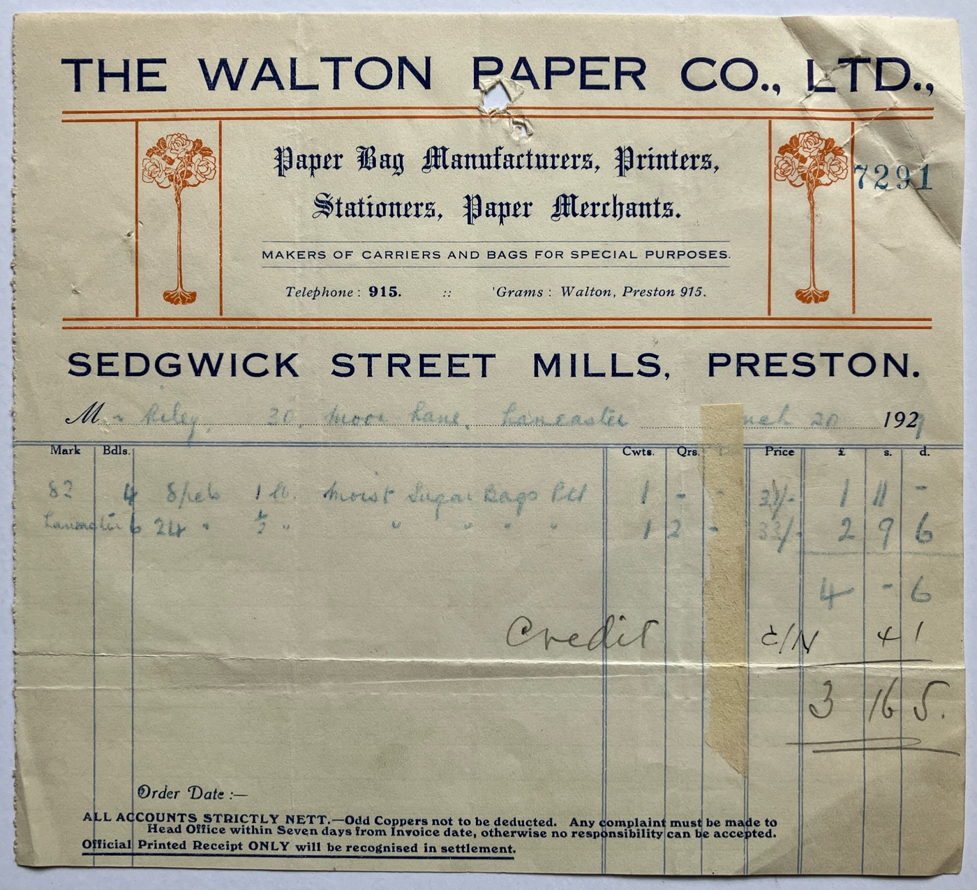 * Invoice ... Original invoice of 1929 from The Walton Paper Co Ltd, bag printers of Preston, to Riley Bros of 30 Moor Lane, Lancaster, for the supply of large quantities of both 1lb and 1/2lb sugar bags ...